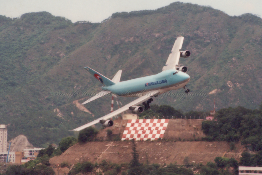 Photo of Korean Air Cargo Boeing airplane turning with Checkboard hill in the background in 1995