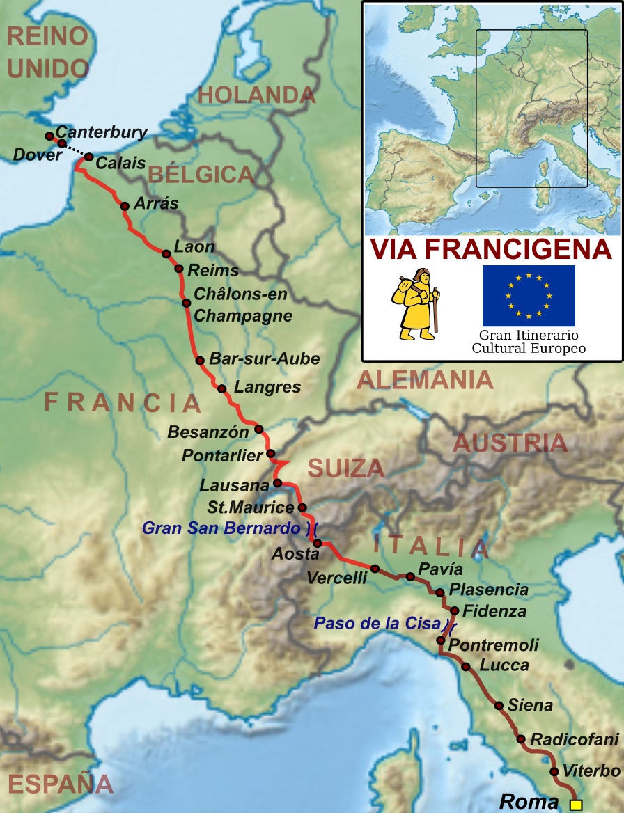 Mapa de la Vía Francígena (ruta completa) con indicación de las principales poblaciones