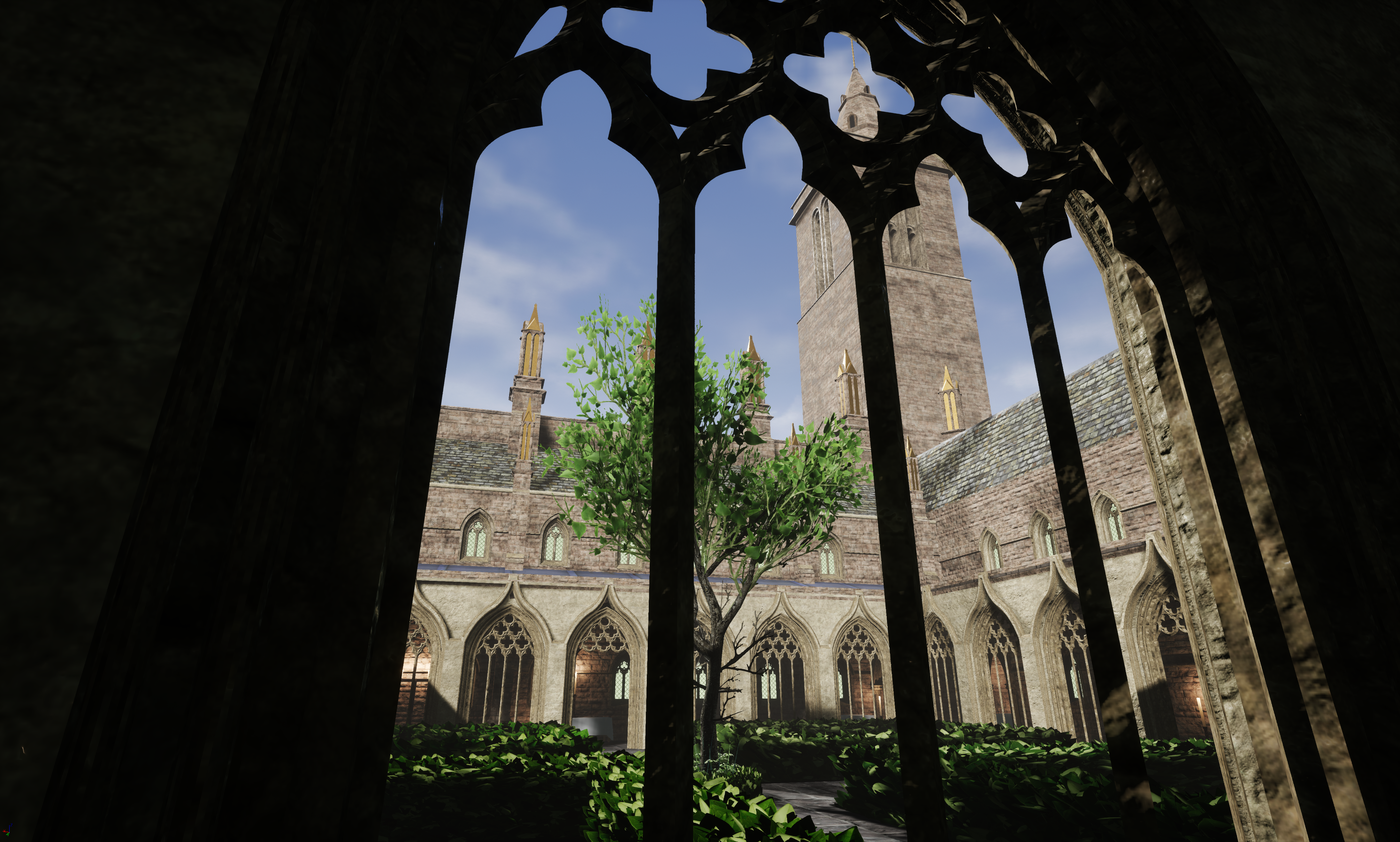 VR view from within the cloister corridors looking from north to south out to the garden and tower.