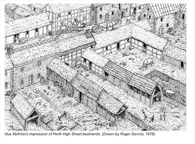Illustration depicting the back streets of Preth by Roger Dennis 1978.