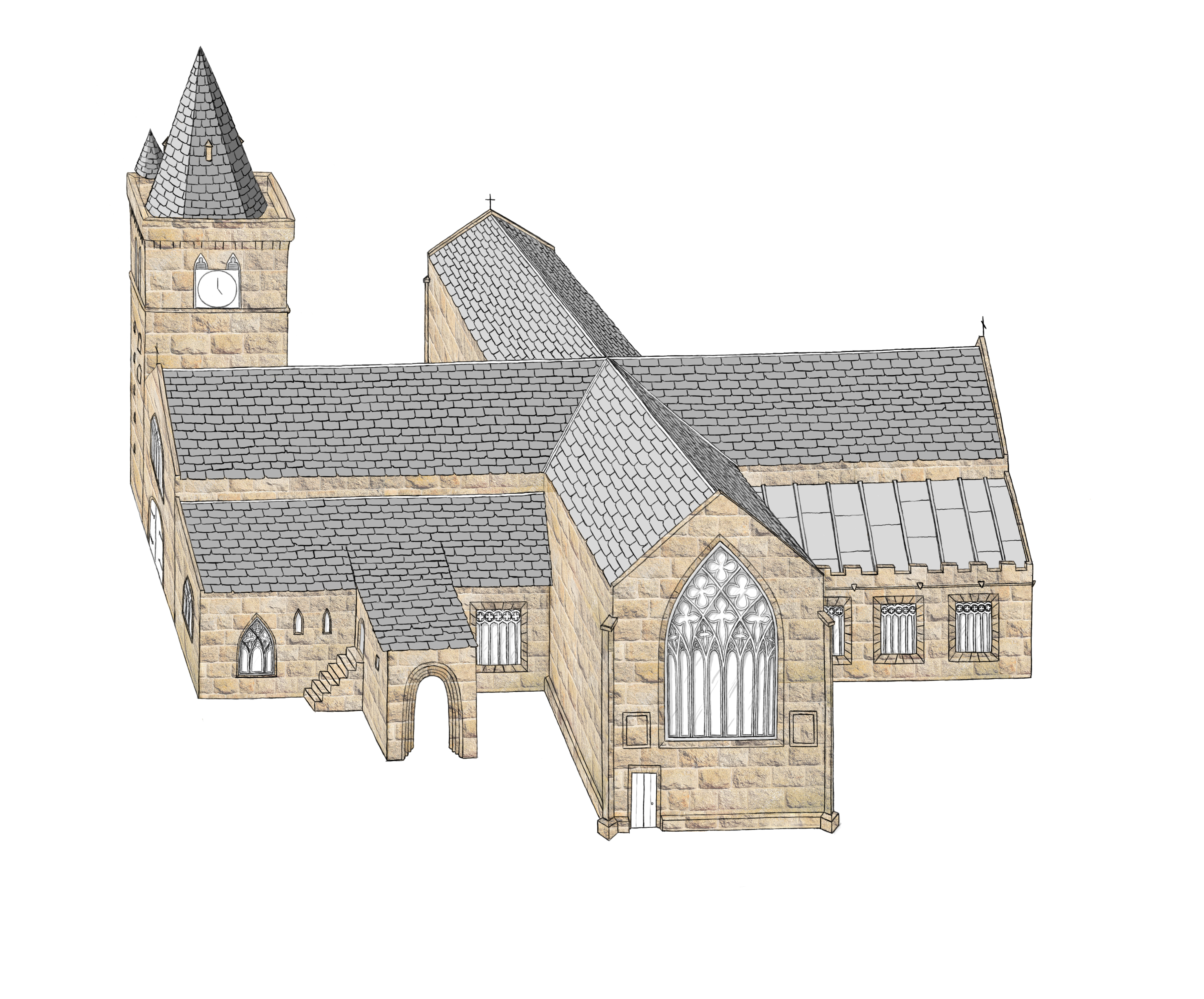 Illustration depicting the architecture of Holy Trinity Church, St Andrews c1559. by Perin Westerhof Nyman. View south West.