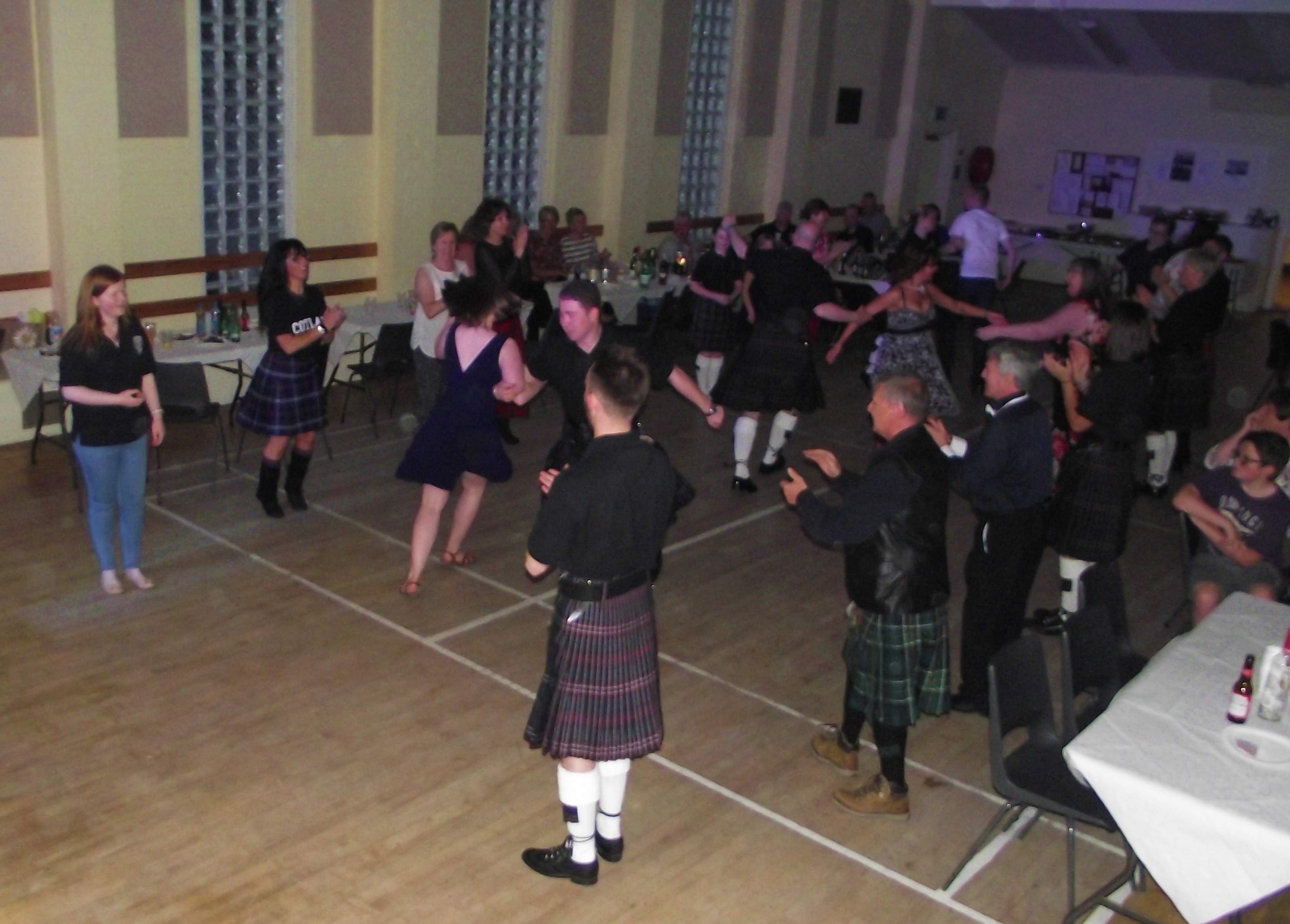 Image shows people in the middle of a ceilidh dance at the Northern Constabulary Community Pipe Band's Fundraising Ceilidh in North Kessock. Several people are wearing traditional Scottish attire such as Kilts.