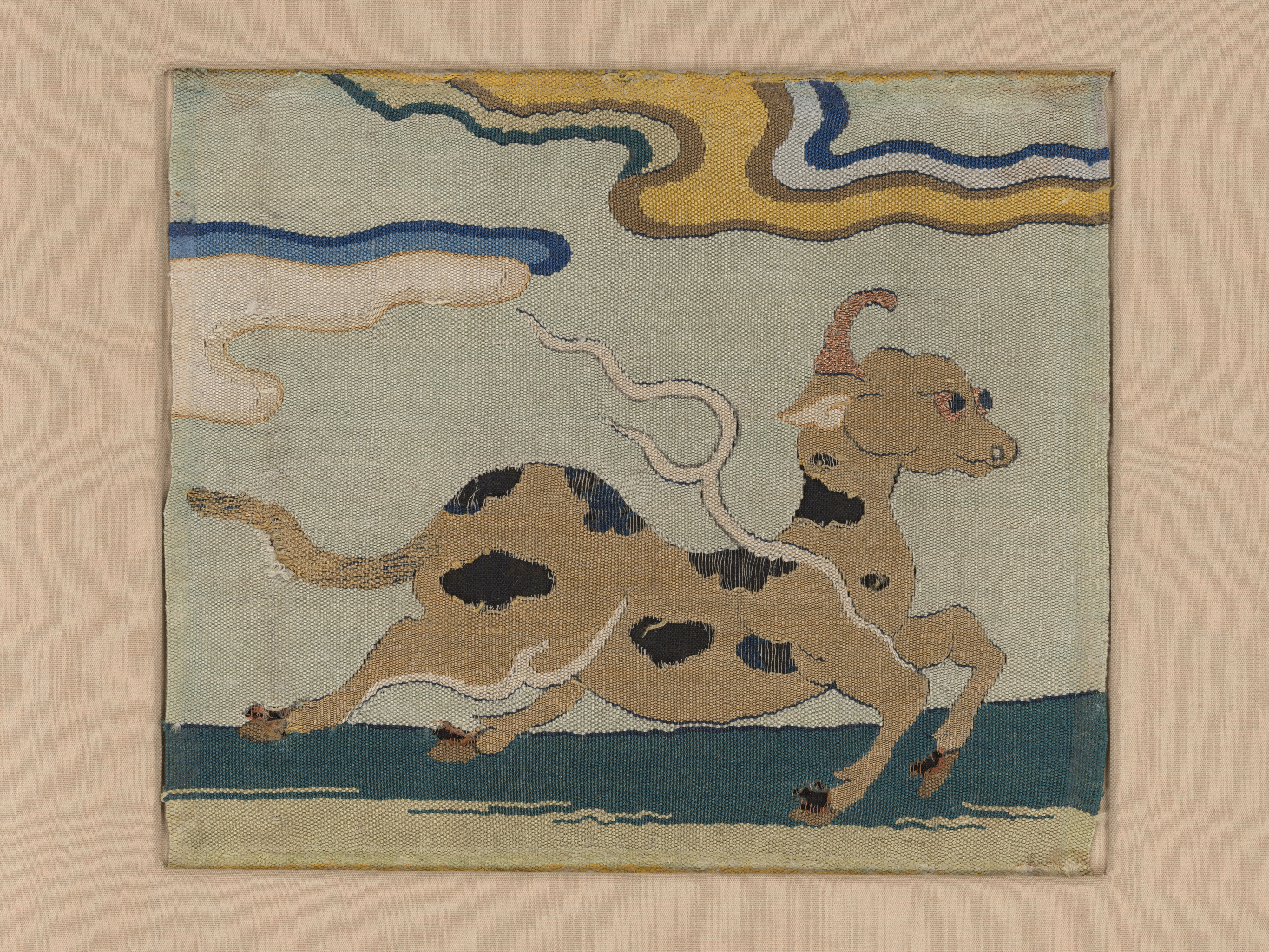 Gold thread accentuates the eyes and single curved horn of this spotted deerlike animal, and the flamelike emanations coming off its body announce its supernatural status. It runs through an abstracted landscape with clouds overhead and a low groundline.
