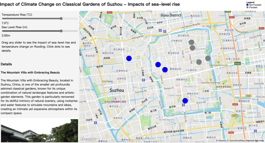 Welcome to our digital exhibition, “Impact of Climate Change on Classical Gardens of Suzhou” an interactive educational project that integrates the latest technology with the preservation of historical heritage. This exhibition, using D3.js technology to create a visual map, shows the public the potential threats global climate change poses to these precious gardens.
