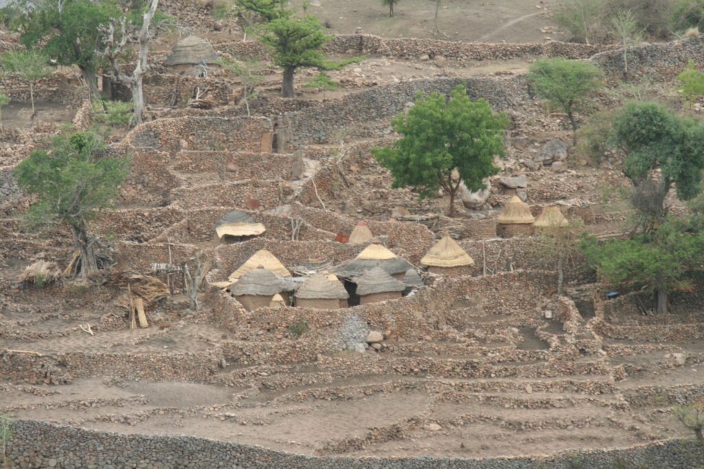 The landscape has remained unaltered for many centuries, providing a vivid depiction of land utilisation that marks critical stage in human settlement and its relationship with its environment which is one of the criterion for its UNESCO status. The Hidi serves as both political and spiritual leader, with a palace of impressive dry stone architecture. Surrounding shrines, some with ceramics, add to its reverence. Villages below display unique indigenous architecture, with dry stone walls and sunken animal enclosures. The Sukur people practice traditional terraced agriculture on Mandara Mountains, preventing erosion and ensuring food security with staple crops and cultural preservation. The Sukur people practice traditional terraced agriculture, crafting stone terraces on the steep slopes of the Mandara Mountains to cultivate crops. They grow staple cereals like millet and sorghum, alongside legumes, root crops, and vegetables. This agriculture ensures food security, sustains livelihoods, and preserves cultural heritage.