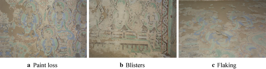 Due to the Mogao Caves’ location, they are susceptible to dust storms, which can pose a hazard to the murals. Murals’ pigments can peel off once the accumulation of dust particles reaches a certain degree.