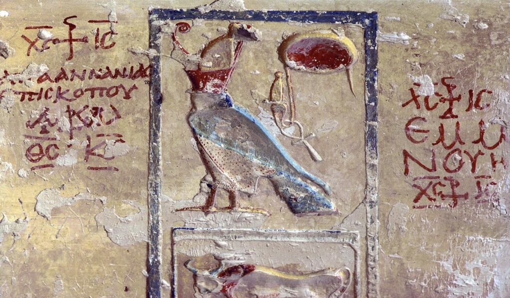 The image shows hieroglyphs from the Byzantine period within the tomb, starting with the Horus name of Ramesses IV, surrounded by Coptic graffiti.4