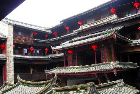 The early-stage Tulou mostly built in the Yuan dynasty to mid-Ming dynasty. The style of Tulou in this stage is that all of them are square shape, and the exterior wall can use as the protection technique and a way to bearing the house. Inside the Tulou are using woods combined with the outer walls to make cell rooms. The inside centre is a vast dooryard. All floors except the ground floor have a corridor all over the floor. The walls of Tulou does not have any stones. The lower thickness of Tulou is around 1.7m-2.0m. The rooms are small inside. The ground floor and the first floor does not have any windows. The upper floors only have some tiny windows. It only has one entry to the outside. The entry door is made of woods. People will find the decoration is almost does not exist in the early stage of Tulou, and the roof is made of tiles.