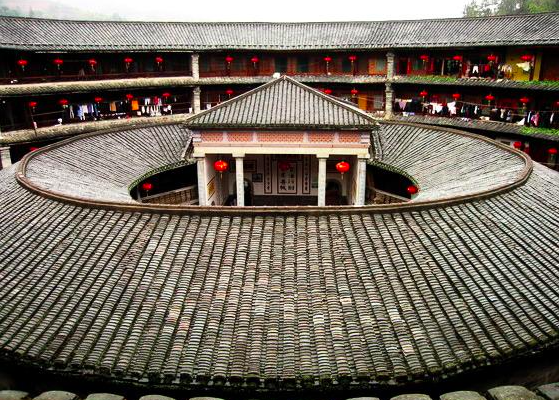 The layout of Fujian tulou followed the Chinese dwelling tradition of “closed outside, open inside” concept: an enclosure wall with living quarters around the peripheral and a common courtyard at the center. A small building at the center with open front served as an ancestral hall for ancestry worshipping, festivals, meetings, weddings, funerals and other ceremonial functions. The ground floor plan includes shapes such as circle, semicircle, oval, square, rectangle, and irregular pentagon.