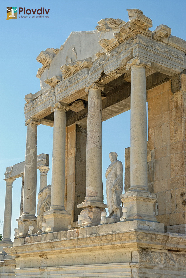The theatre consists of a semi-circle cavea (seating part) and orchestra (stage). The cavea has 28 concentric rows of marble seats, divided by an isle and oriented south, above the stage the spectators can see the city and the Rhodopa mountains in the distance. There is a building behind the orchestra also called scaenae frons. It has three floors and is fascinatingly decorated with columns, statues and two porticos – one in the Ionic Order and one in the Corinthian order of Roman Architecture. In a characteristic for the Roman Empire Theatre fashion, the honorary spectator seats for members of higher society were inscribed so everyone knew where to sit. According to archaeologists, subscriptions were found not only for local government representatives, but for high magistrates and even friends of the emperor.
